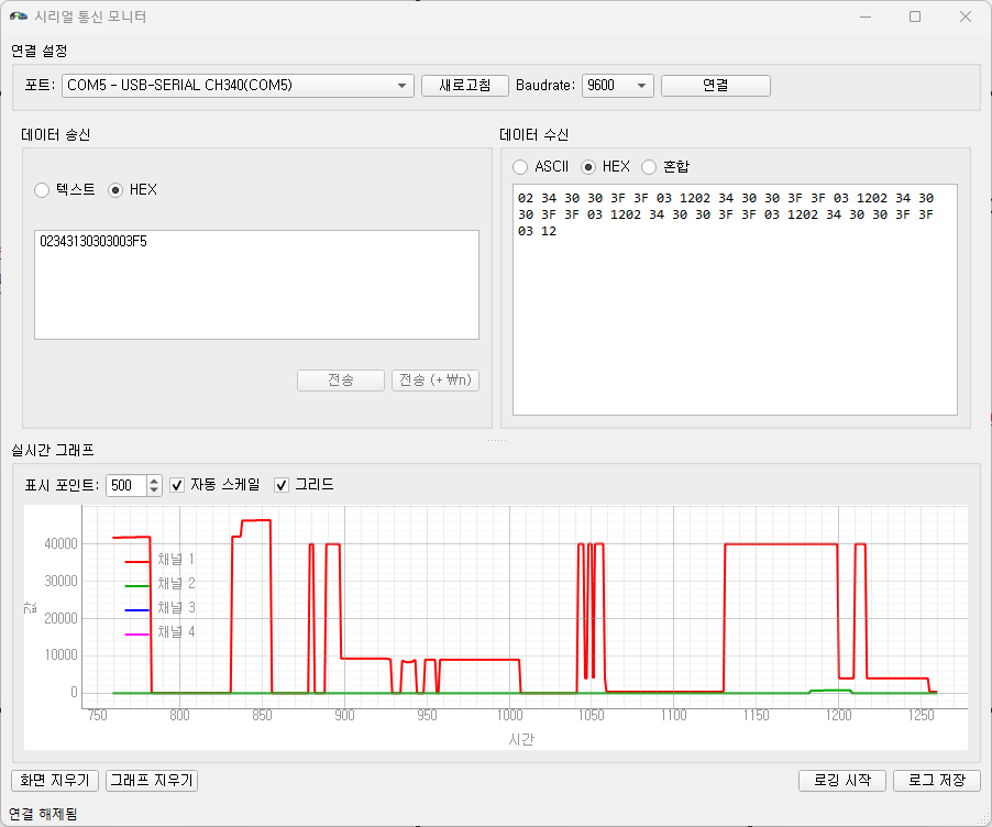 - 연결/연결 해제: 시리얼 포트 연결 및 해제