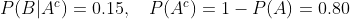 여기서 P(B|A^c)는 고혈압이 아닌 사람이 비만일 확률입니다. 예를 들어, 고혈압이 아닌 임직원 중 15%가 비만이라고 가정하면