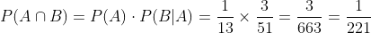 따라서, 첫 번째 카드가 에이스일 때 두 번째 카드가 에이스일 확률은 1/221로, 두 사건은 종속적입니다.