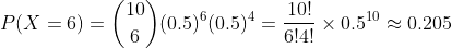 따라서, 10번 던졌을 때 앞면이 6번 나올 확률은 약 0.205입니다.