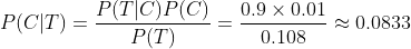 이제, 베이즈 정리를 사용하여 양성 반응 시 암에 걸릴 확률 P(C|T)을 구합니다.